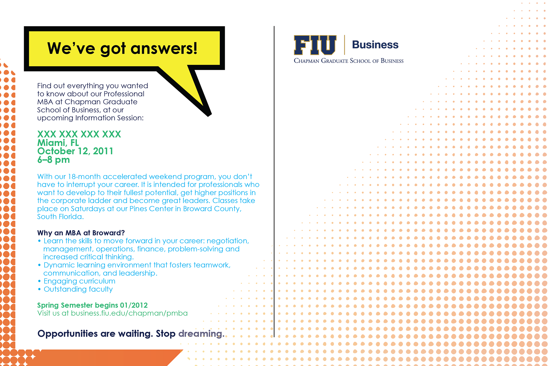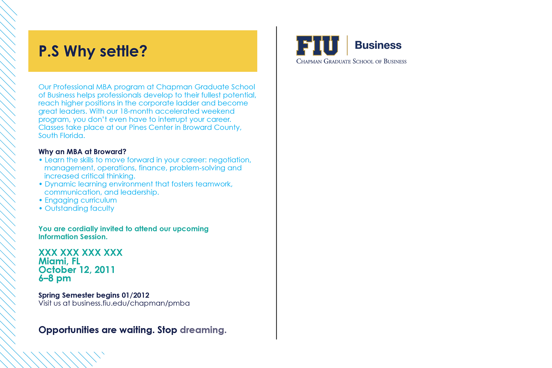 Designed a series of postcard to entice professionals to sign up for an informative session and consider enrolling to the MBA program at Florida International University.